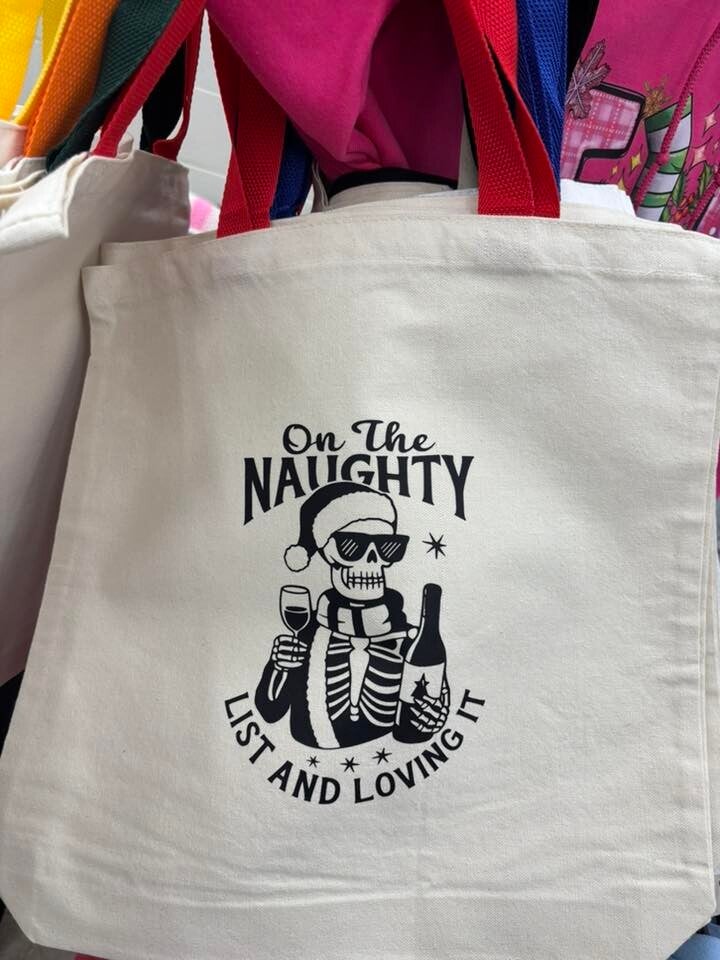 Tote with red handle, On the naughty list and loving it Santa Skeleton